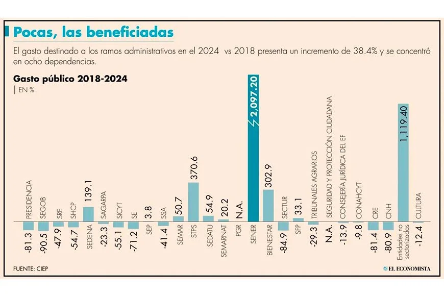 El CIEP destacó que, del 2018 al 2024, el gasto de los ramos administrativos presentará un incremento de 38.4%, una tasa mayor al aumento de gasto total en el sexenio previo, de 20.5 por ciento.